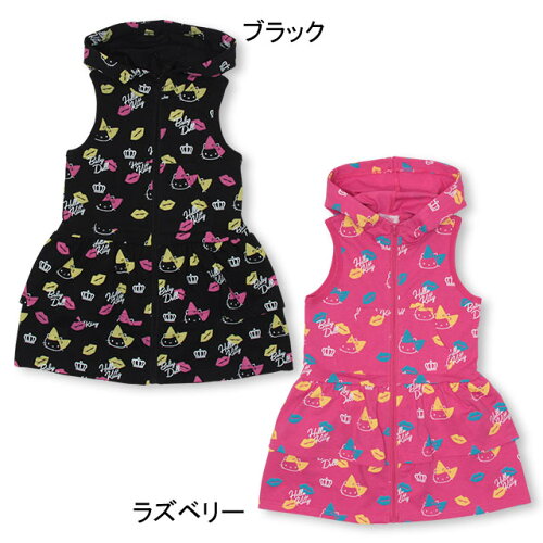 こども 子ども服 ノースリーブ ワンピース 人気キャラクターデザイン ハローキティ キティちゃん リボン キスマーク リップ柄 王冠ロゴ ミニ丈 膝上 レイヤード フリル ガールズコーデ おしゃれ 可愛い かわいい ガーリー POP ポップ キュート 個性的 派手かわ カジュアル 重ね着 ★